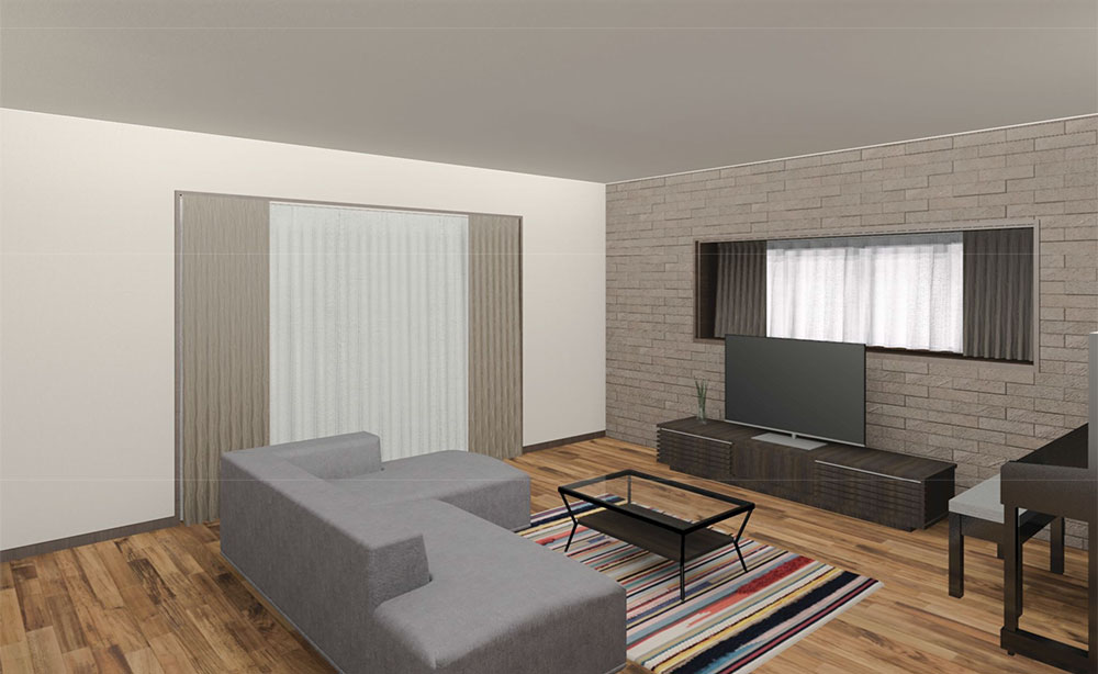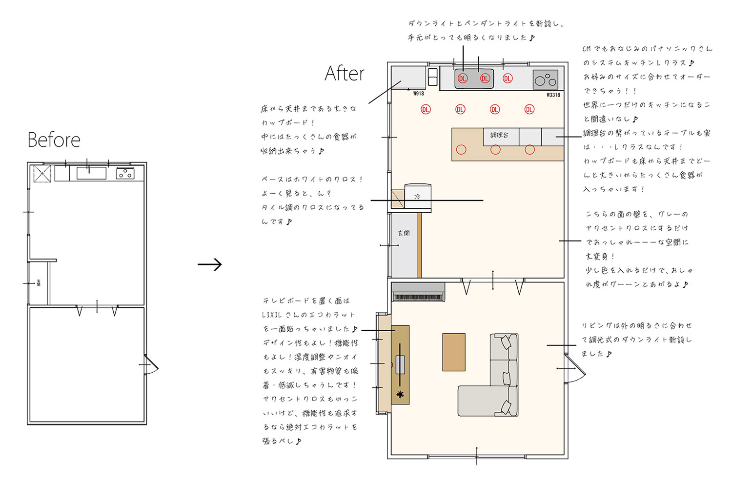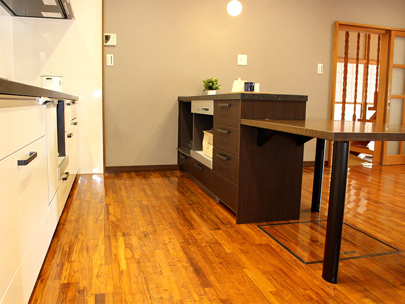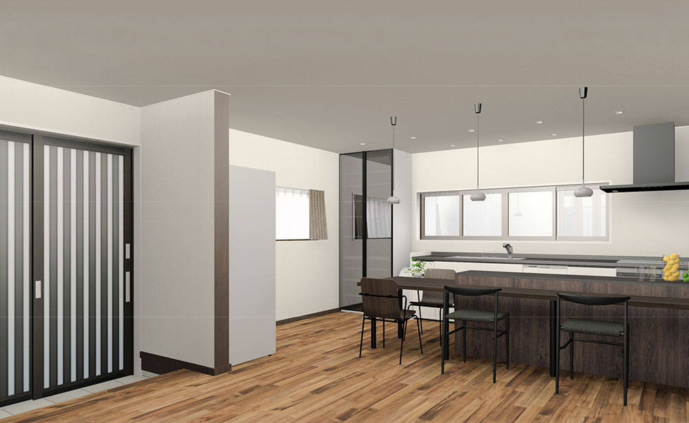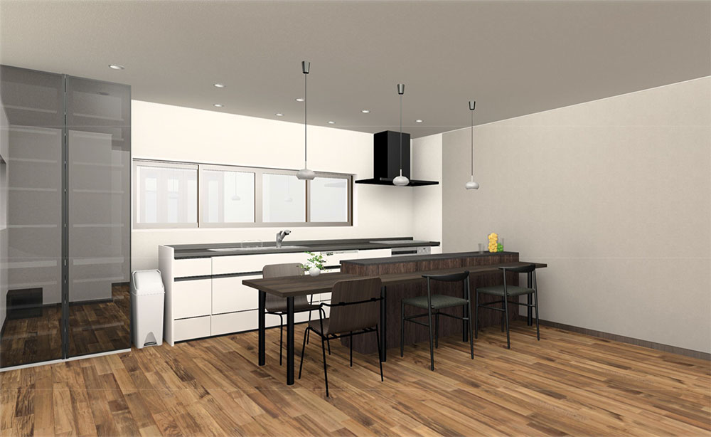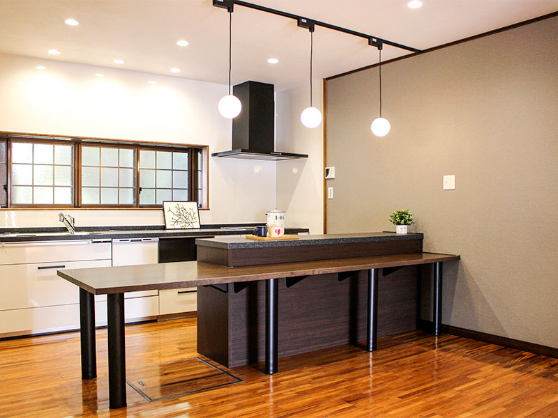 キッチンから調理台、カウンターまで統一感が出るようにデザイン。リビングの方もアクセントでエコカラットを貼ることでカッコよく仕上がりました。