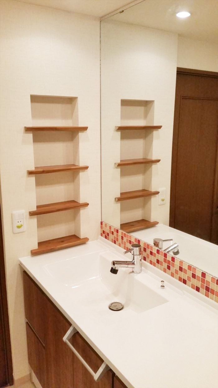 洗面化粧台:Panasonic Cライン タイル:LIXIL ガラスモザイク パーティーカラー ニッチ:Panasonic ベリティス 耐水カウンター 壁紙:サンゲツ リザーブ AA級 クッションフロア:サンゲツ H-FLOOR HM級 |